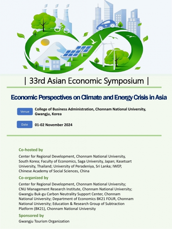 전남대학교 지역개발연구소와 광주북구탄소중립지원센터가 공동주최하는 제33차 아시아경제심포지움(33rd Asian Economic Symposium)이 아래와 같이 개최됩니다.